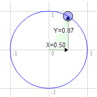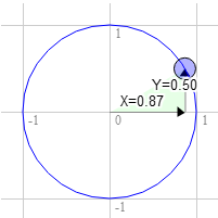 Notice as you drag the blue handle around the circle the X and Y positions change. Those represent the position of that point on the circle. At the top Y is 1 and X is 0. On the right X is 1 and Y is 0.