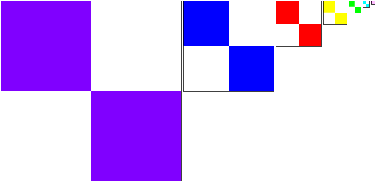 So what the GPU does is it uses a mipmap. A mipmap is a collection of progressively smaller images, each one 1/4th the size of the previous one. The mipmap for the 16x16 texture above would look something like this.